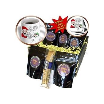 Sean Boley Cartoon about Santas Weight Coffee Gift Basket is measuring 9x9x4. Contains 15oz mug, BONUS free set of 4 coasters, biscotti and 5 blends of gourmet coffee. French Vanilla, Kenya AA, Decaf Colombian Supremo, Chocolate and Italian Roast Espresso elegantly presented in our signature black planet coffee gift box. A very nice and thoughtful gift for any occasion.